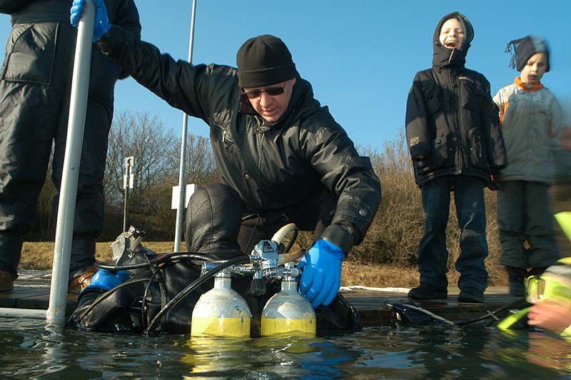 Am 16. Februar 2003 trafen sich einige Mitglieder meines Tauchvereins, des DUC Krefeld, an unserem Hausgewässer, dem Elfrather See. Bei schönstem Winterwetter unternahmen wir einige Tauchgänge unter dem Eis des zugefrorenen Sees. Die Bilder zeigen die Beteiligten bei den Vorbereitungen und während des Tauchens über und unter Wasser. Insgesamt 26 Bilder.